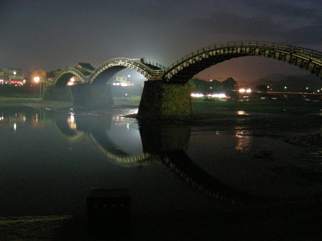 「広島・宮島・岩国地域観光圏推進事業」の 一環で1月18日まで原爆ドーム・厳島神社 もライトアップされます。平素の錦帯橋は 夜間、背の高いライトがついているだけですが、この期間は両川岸に設置された8個のライトが、橋の美しい裏側も照らし出しています。ライトアップされる時間は18時~21時までです。(ライトアップ前とライトアップ後の写真です。)