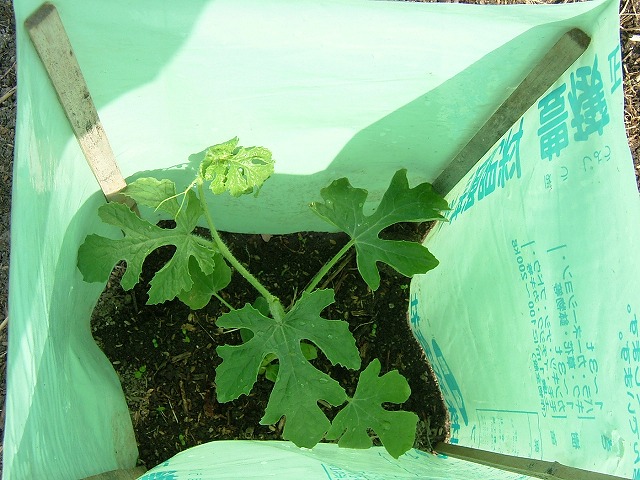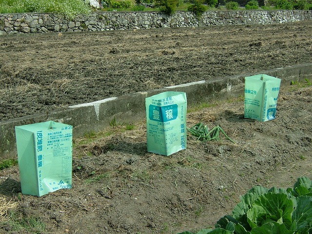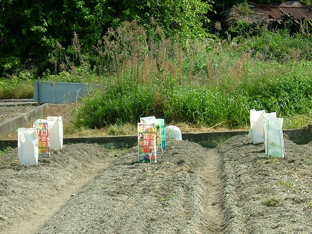 スイカとマクワウリの苗を植えました。苗が風で倒れないように「灯籠」仕立てにします。腐葉土や肥料が入っていた袋を再利用して「風防」です。今は、あちこちの畑に色とりどりの「灯籠」が立っています。