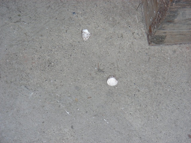 知人宅のツバメが遂に孵化したようです。早速取材に行くと、巣の下に小さな小さな卵の殻が落ちています。拡大して観て下さい。殻は小指の先ほどしかありません。孵化した雛は直ぐにピーピー鳴いて口を開けるのかと思っていましたが、母親はじっと動きません。雛の声もしません。殻の大きさから想像するに孵化したばかりの雛って相当小さい?殻は合計3羽分です。飼い主(?)は「もう2個くらい抱いてるんじゃないか」と言っています。愛鳥週間にふさわしい話題になりました。賊に襲われないように祈るばかりです。