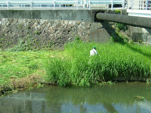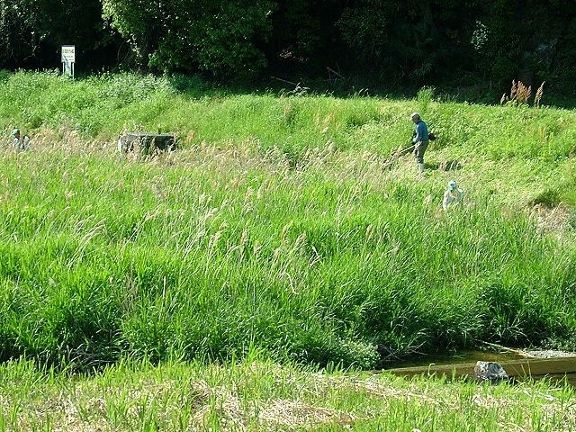 NPOの活動日でした。背丈以上に伸びた葦や雑草と格闘する会員たちは、これから暑さとも格闘しなければなりません。