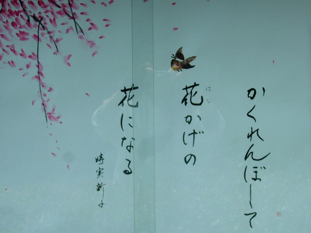 お寺の掲示板です。「かくれんぼして 花かげの 花になる」時実 新子