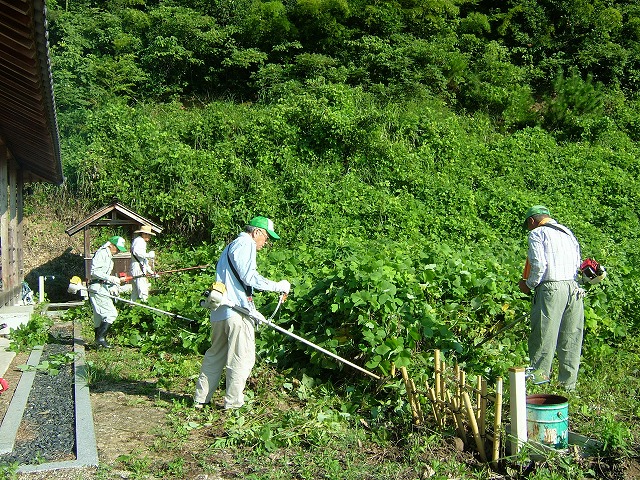 モンスターのようになっていた草を刈るとこの場所が墓地として整備されていた事が解りました。全く見えなかったのですが、3基の納骨堂まで出てきました。お寺は現在無人なので、一年経てば(残念ですが)また草に覆われる事でしょう。それにしても会員のパワーは凄いです。