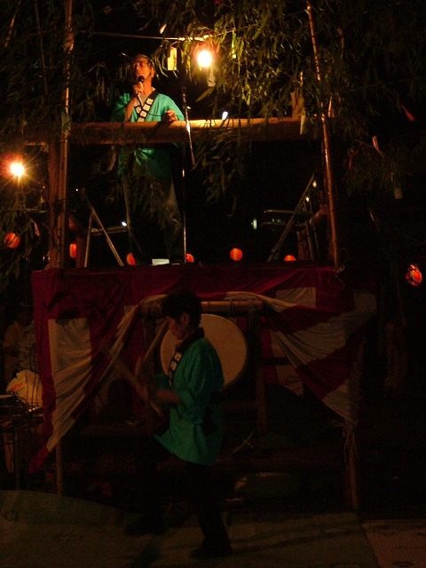 カメラマンの腕とカメラの両方が悪くてこんな写真しか撮れませんでした。櫓の上で歌っている男性も下で太鼓を叩いている女性も竹馬の友です。