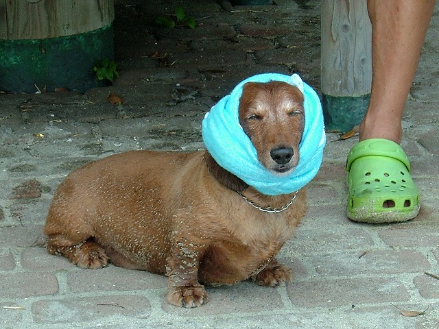 でも砂浜にはこんな愛らしいワンチャンが。前に一度会った事がある「ヨッチャン」です。海に入って散々遊んだ後、砂浜でゴロゴロ転げまわって汚れたために拭いてもらったタオルで頬被りして貰っていました。嫌がらずに得意げでパパが「ヨッチャン写真だって」と言うと、ちゃんとカメラ目線でオスマシしてくれました。