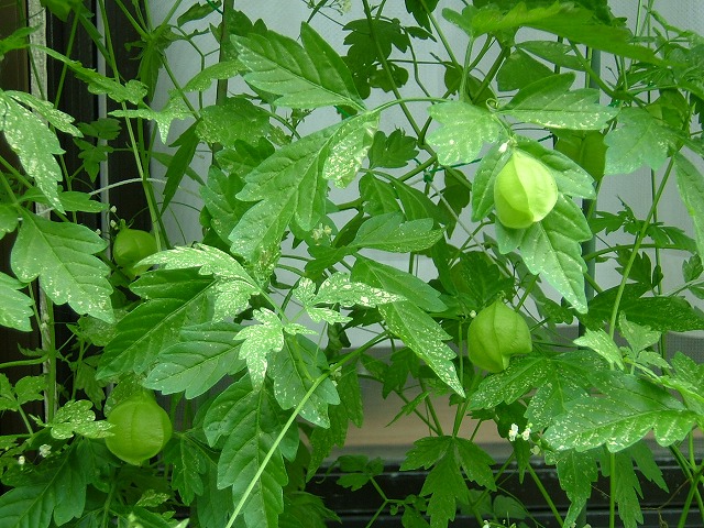 台所の外の「みどりのカーテン」は「風船かずら」です。もうこんなに愛らしい風船を沢山つけました。でも蔓は期待したほどには伸びず、まだカーテンの役は果たせていません。