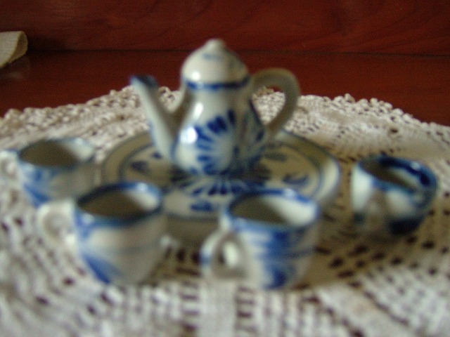 こんなに小さいセットです。比較に置いてあるのが普通サイズ。ポットの蓋もちゃんと開きます。荷物にならないのと可愛らしさに魅かれてつい買いました。