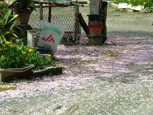 近くを歩いていたら、畑の中に「アスパラガス」が伸びていました。モシャモシャした葉っぱがないのでこんな姿で元気良く育っています。初めて見ました。もう1枚は他所のお庭に散り敷いた桜。