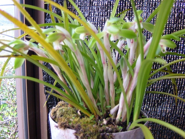 もう7~8年前になるかもしれません。通津で知り合ったばかりの友人に誘ってもらって山歩きに行き、道端に咲いていた「春蘭」を「盗掘」してきました。それから毎年数個づつ咲いていますが、今年はご覧の通り14個もの花をつけ見事です。アップの方で観ると本当に可憐な花でしょう?