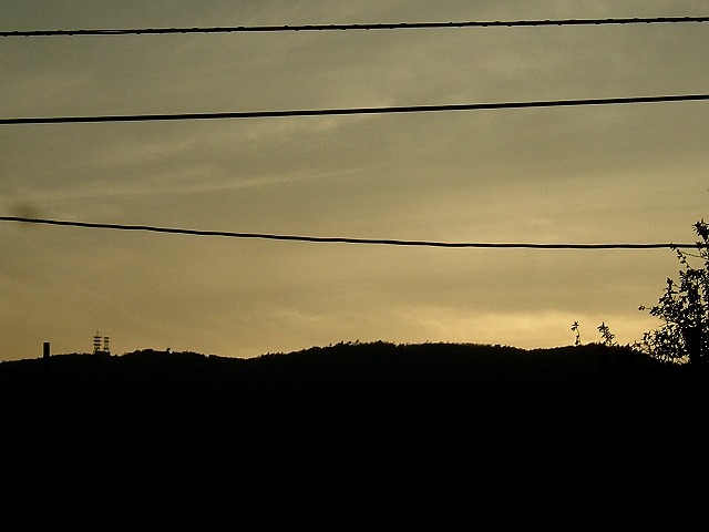 雨と風がやっと静まって静かな夕方になりました。午後6時半の空です。家の庭にいれば十分に明るく(右側)、日没の西側の山は暗く見えます。