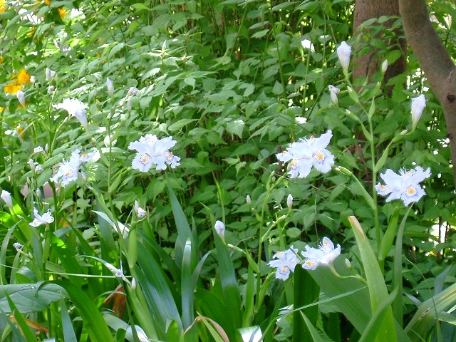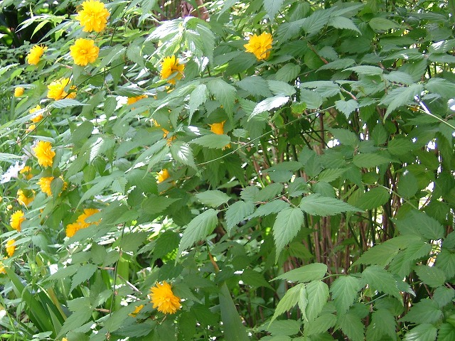 陽当たりの良くない家の裏に、「シャガ」と並んで咲いている「八重山吹」